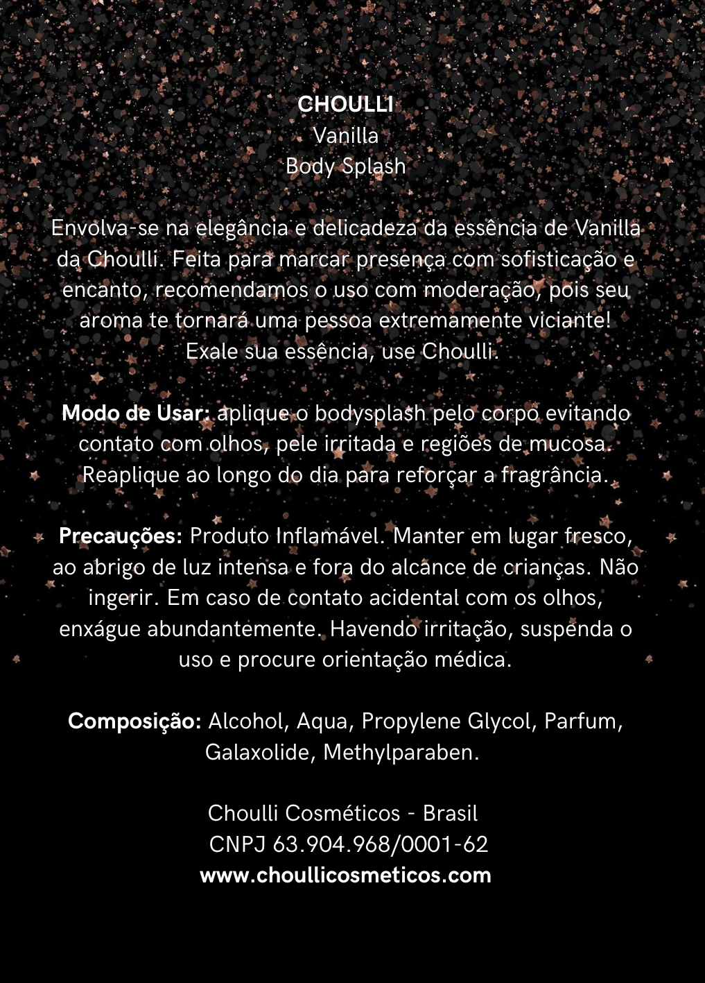 Envolva-se na elegância e delicadeza da essência de Vanilla da Choulli. Feita para marcar presença com sofisticação e encanto, recomendamos o uso com moderação, pois seu aroma te tornará uma pessoa extremamente viciante!